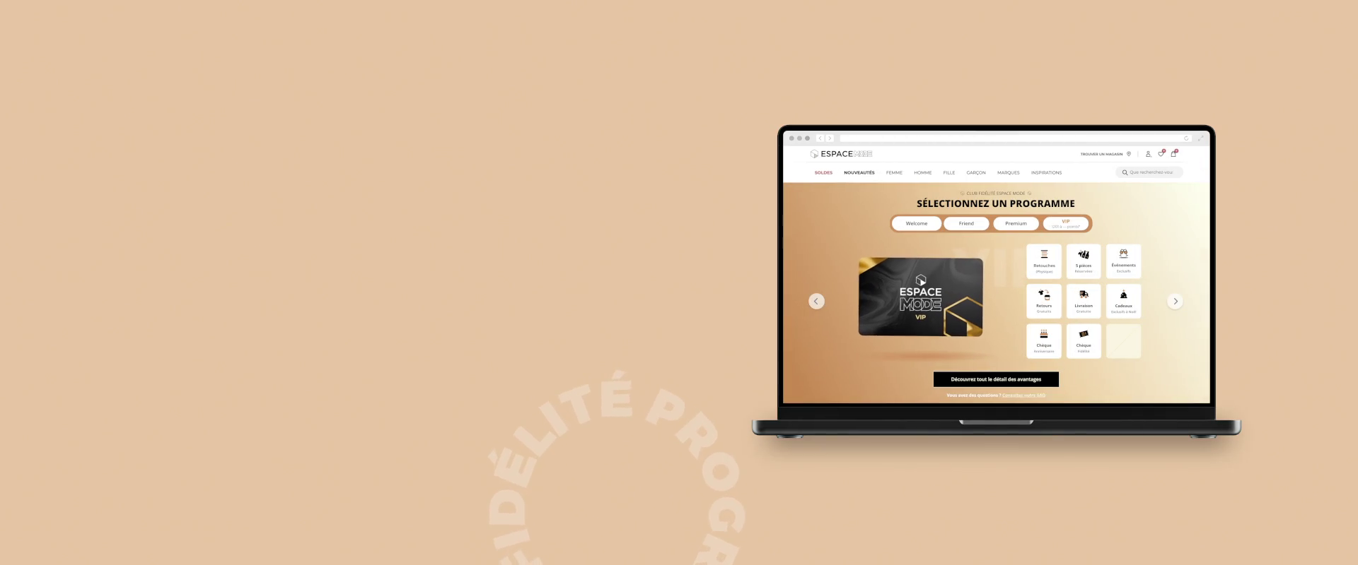Pour donner vie à ce programme, nous avons développé une identité visuelle forte pour les cartes de fidélité, réparties en quatre niveaux distincts. Chaque niveau a été soigneusement conçu avec son propre style graphique, avantages exclusifs et badges associés, renforçant l’idée de progression et de récompense pour les clients les plus fidèles. Ce design stratégique valorise chaque étape du parcours client, transformant chaque badge obtenu en symbole de leur relation avec Espace Mode.